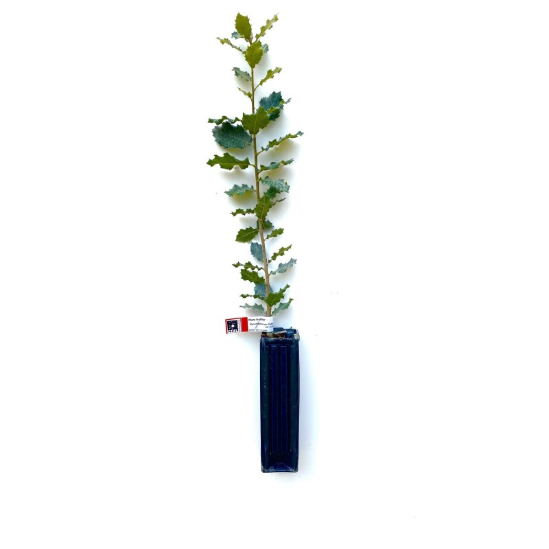 Jeune plant truffier de chêne vert (Quercus ilex) mycorhizé par tuber mélanosporum de 2 ans en godets anti-chignon de 450cc. Contrôlé et certifié par le CTIFL.